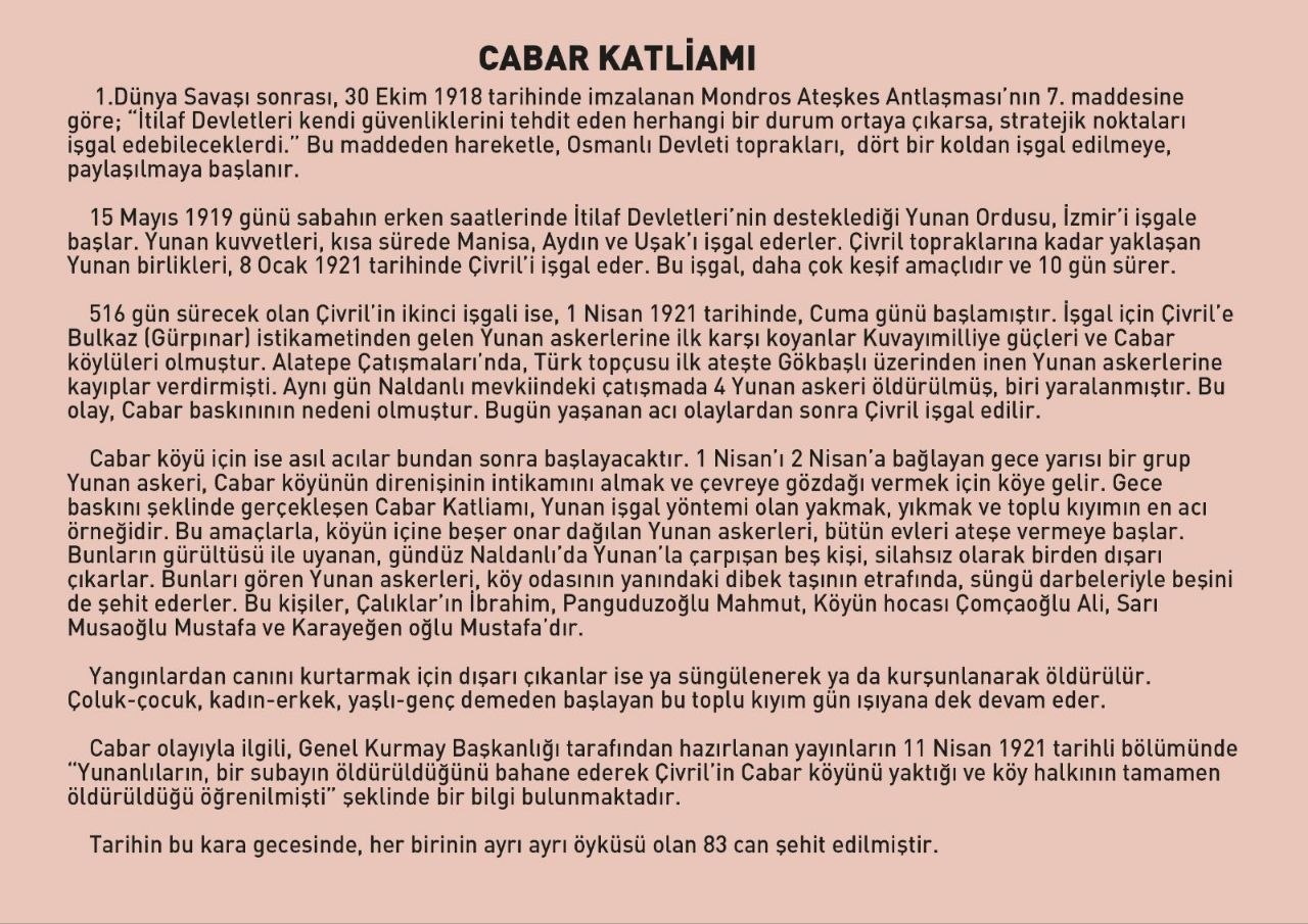 Mondros Ateşkes Antlaşması sonrası başlayan işgal sürecinde, 1 Nisan 1921’de Çivril’e giren Yunan birliklerine karşı gösterilen kahramanca direnişin ardından yaşanan Cabar Katliamı’nın 105. yılında anma töreni düzenlenecek.